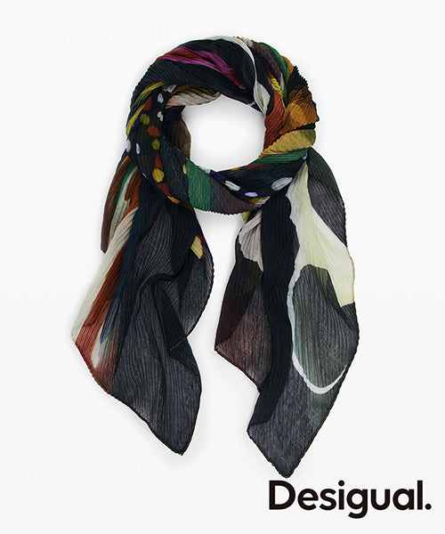 ムッシュ・クリスチャン・ラクロワがデザインした抽象的なプリントとラメ糸のディテールが施されたプリーツ素材の長方形スカーフ。