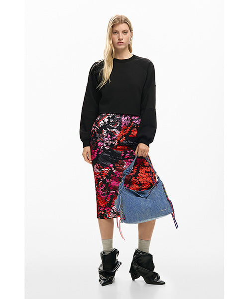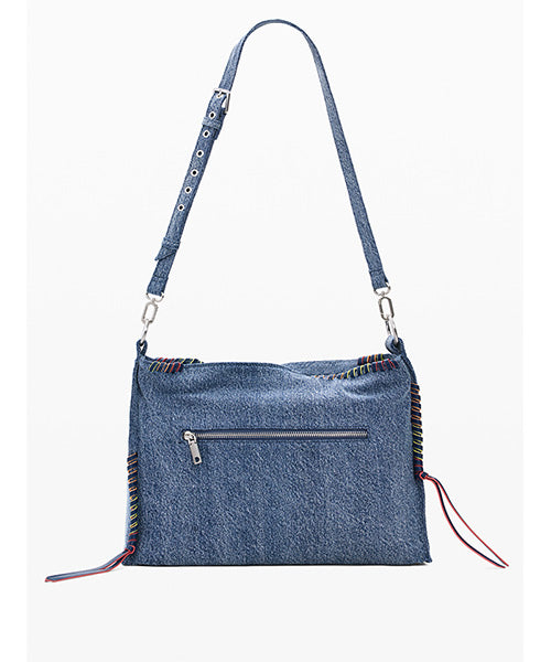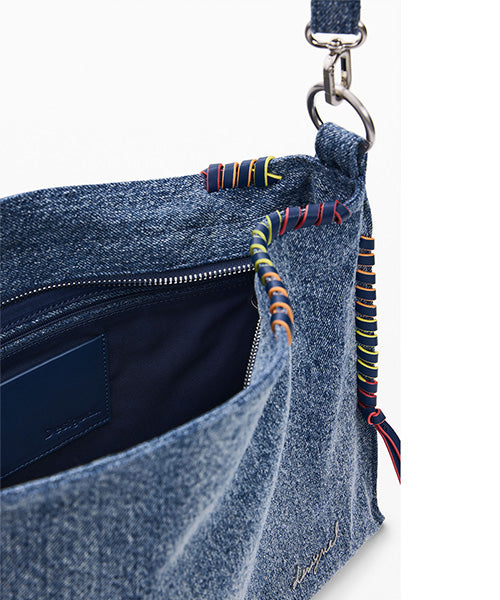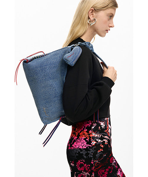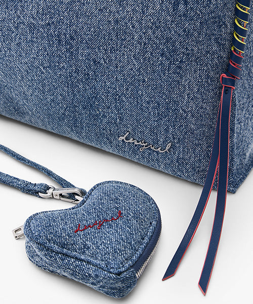 デニム生地を使用した大きなバッグで、縁に編み込みのディテールがあり、取り外し可能なハート型コインパースチャーム付きです。