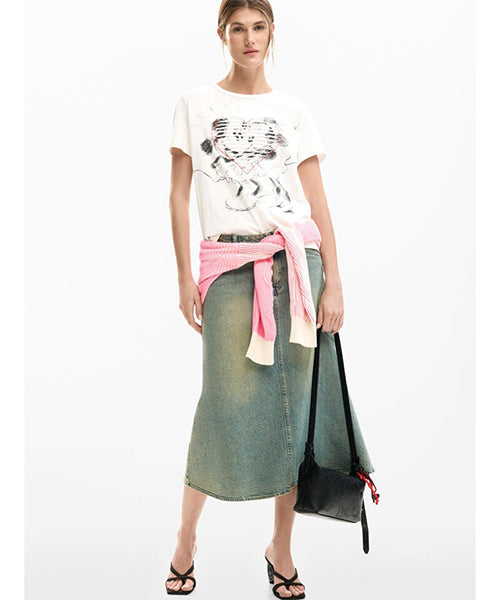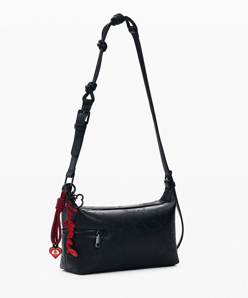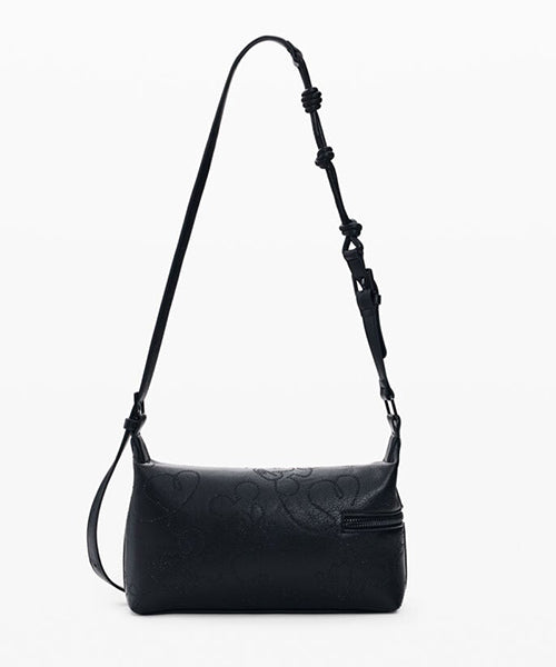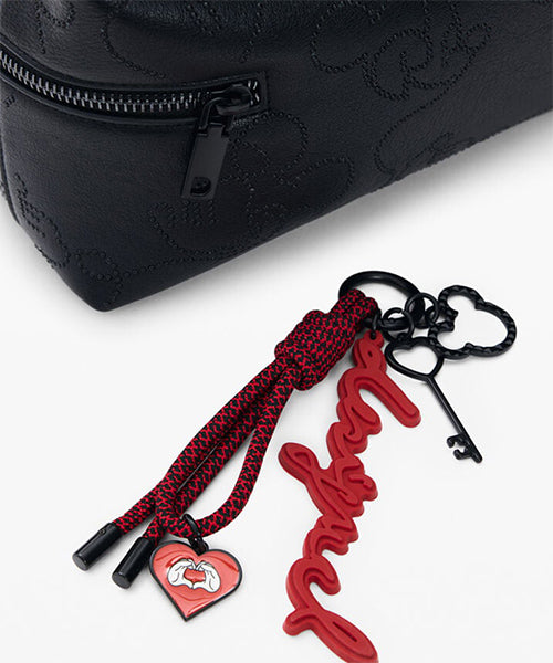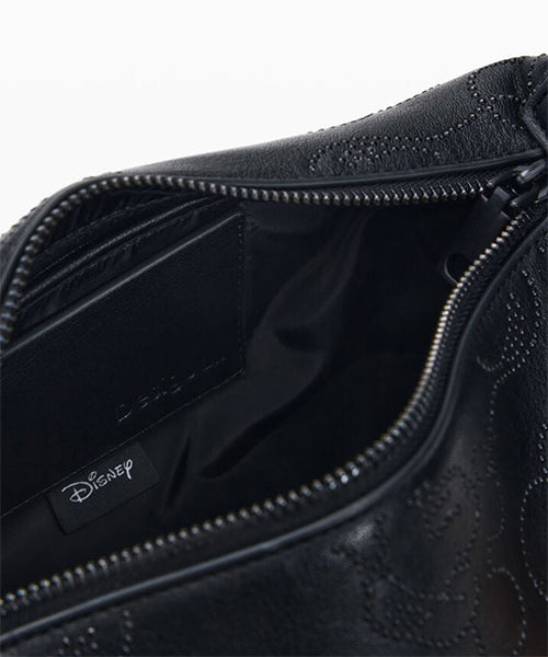 ミッキーマウスのシルエットのメタル装飾が施されたフェイクレザー調のミディアムバッグ。 付け替え可能なストラップ、取り外し可能なチャーム、ファスナー付き外ポケットが付いています。