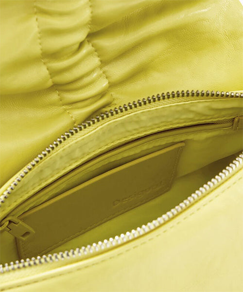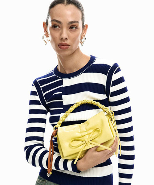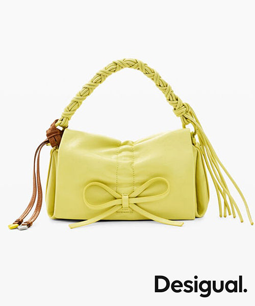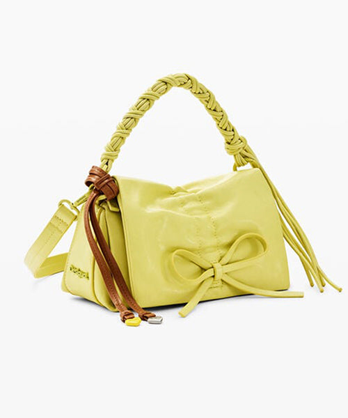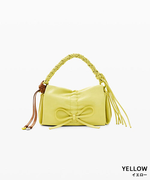 フェイクレザーを使用した小型のクロスボディスタイルのバッグです。 光沢のある仕上げ、リボンのディテール、交換可能なハンドル、取り外し可能なキーリングを備えています。