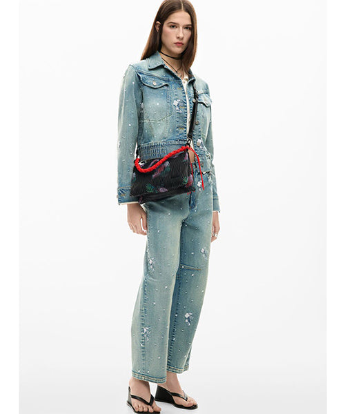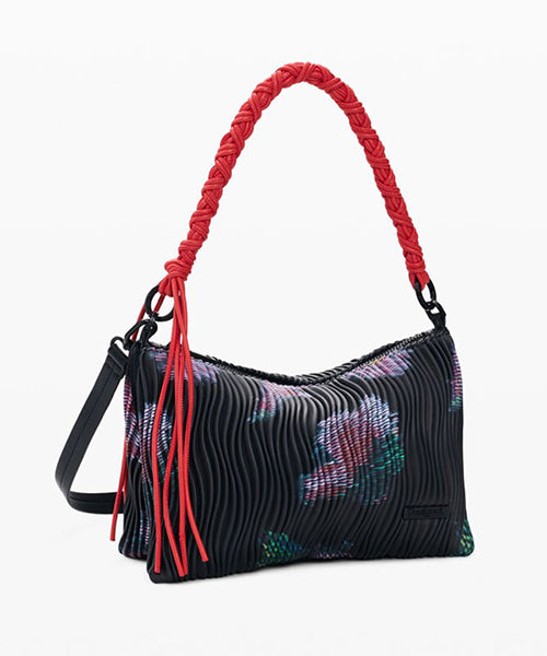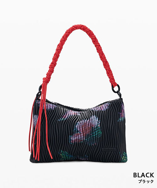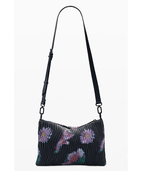 レリーフ調のレザー風テクスチャーと抽象的な花柄のプリントが施された中型サイズバッグです。