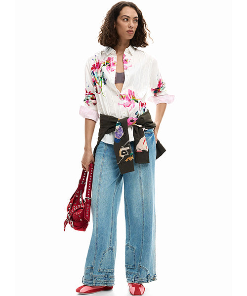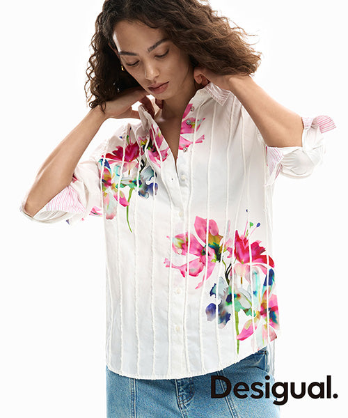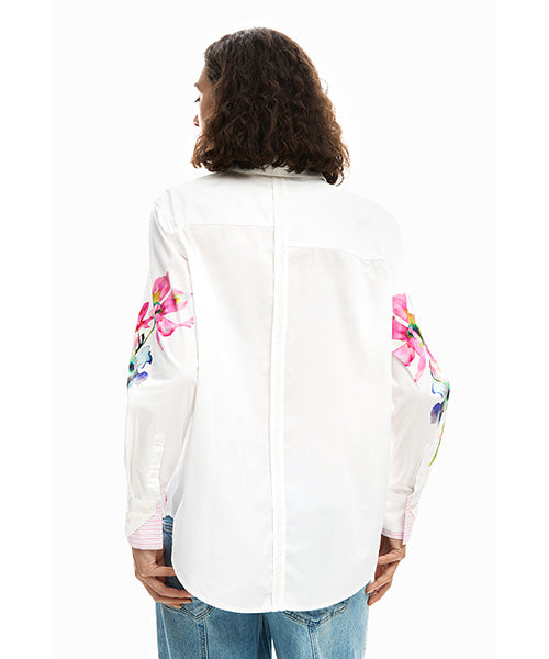 プリーツデザインの大きなカラフルな花柄長袖シャツです。