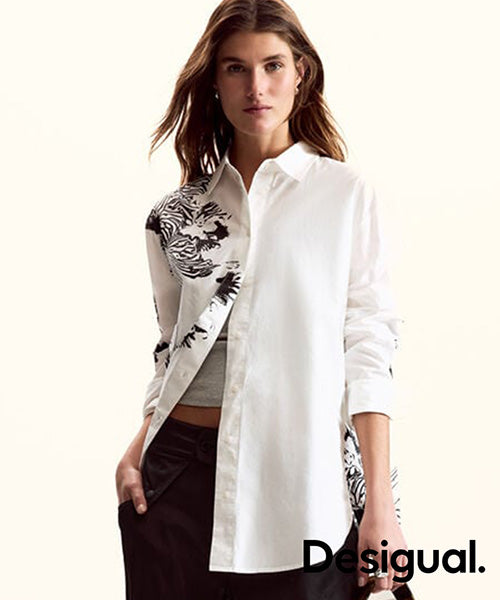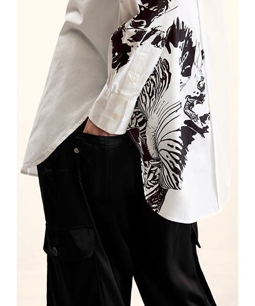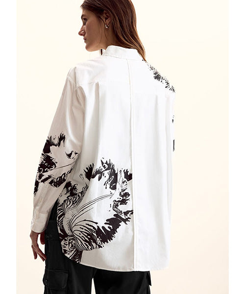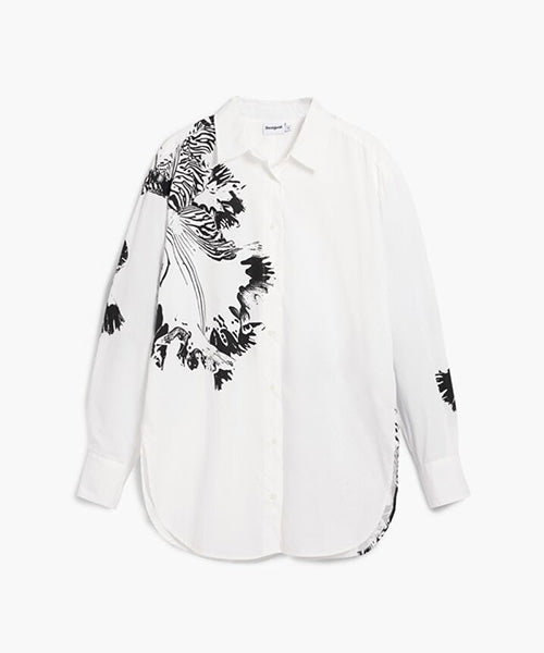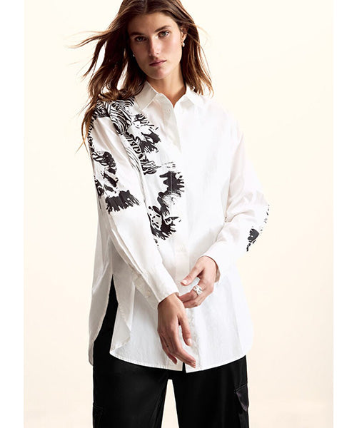 無地の生地をベースにしたオーバーサイズシルエットの長袖シャツで、M. Christian Lacroix によるデザインプリントが施されています。
