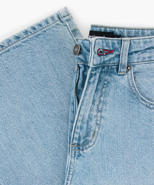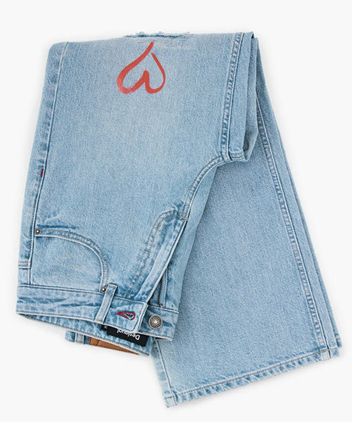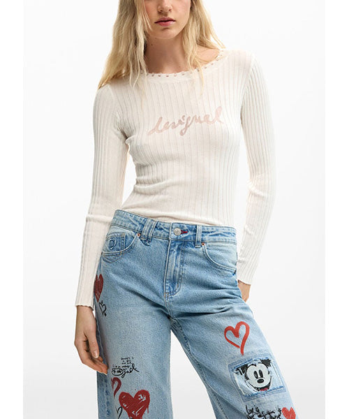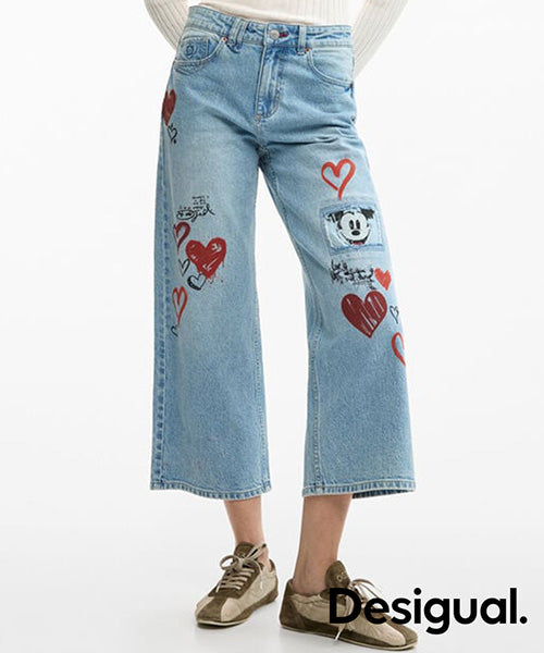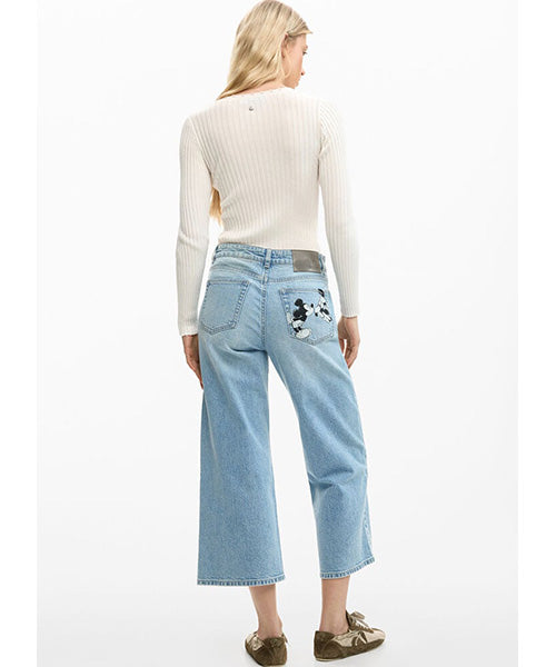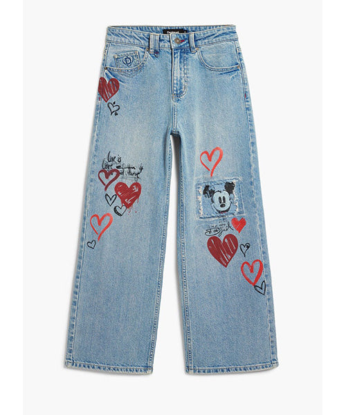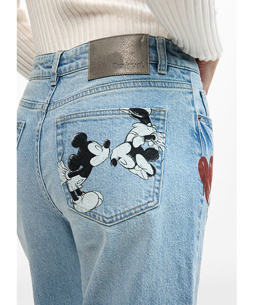 ミッキーマウスのプリントとレタリングスタイルのディテールが施されたストレートカットのデニムパンツ。