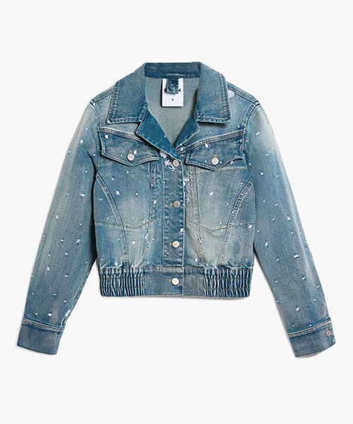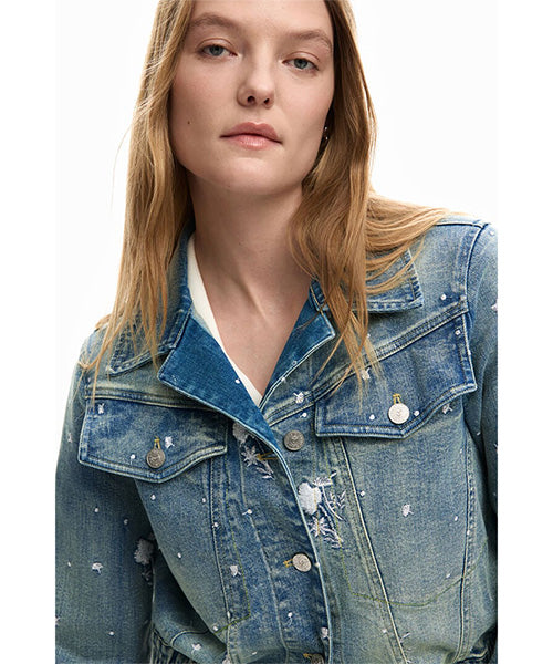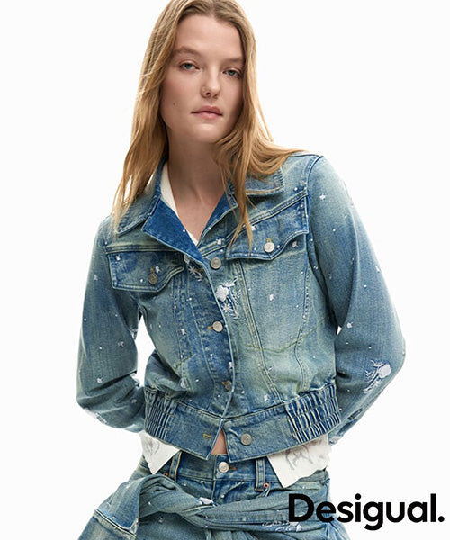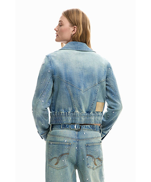 トラッカースタイルのデニムジャケット。襟付き、ウエストにゴム、小さな刺繍のディテールです。