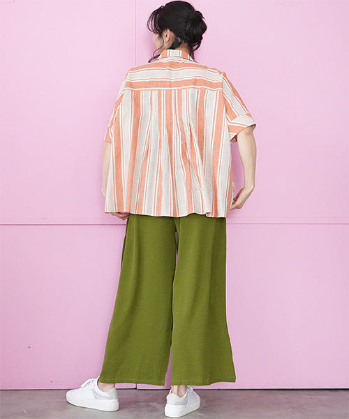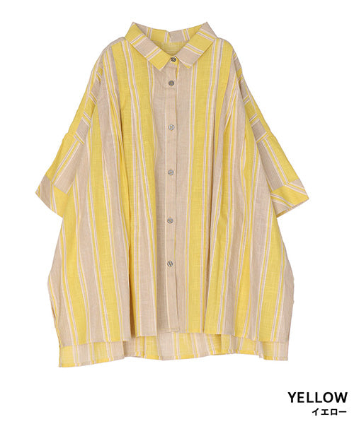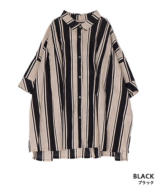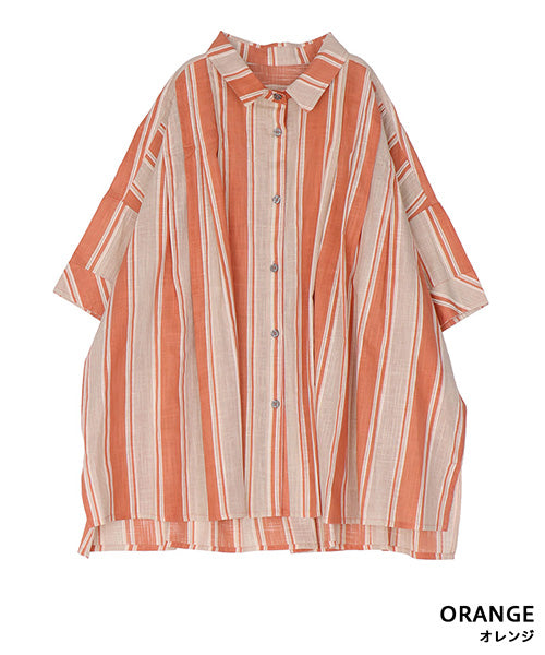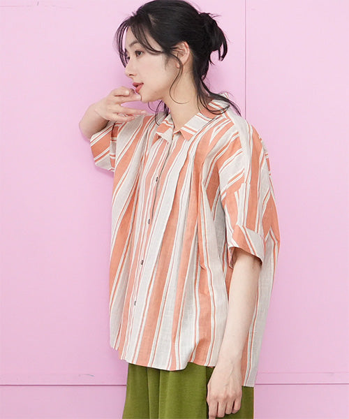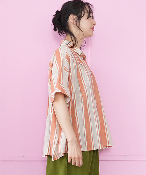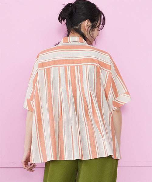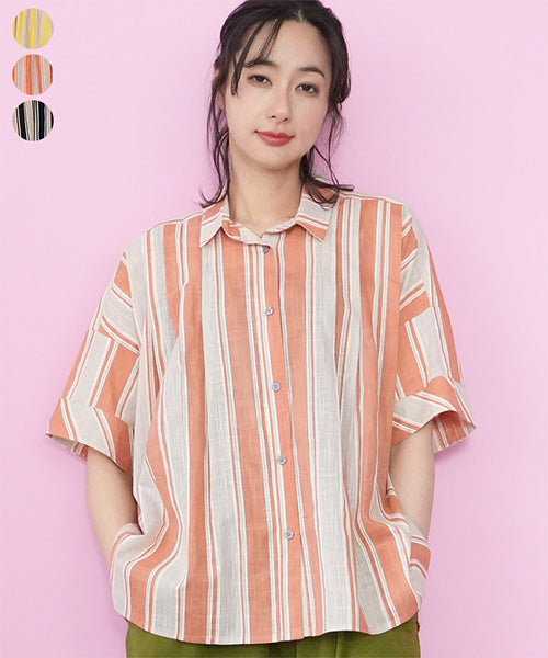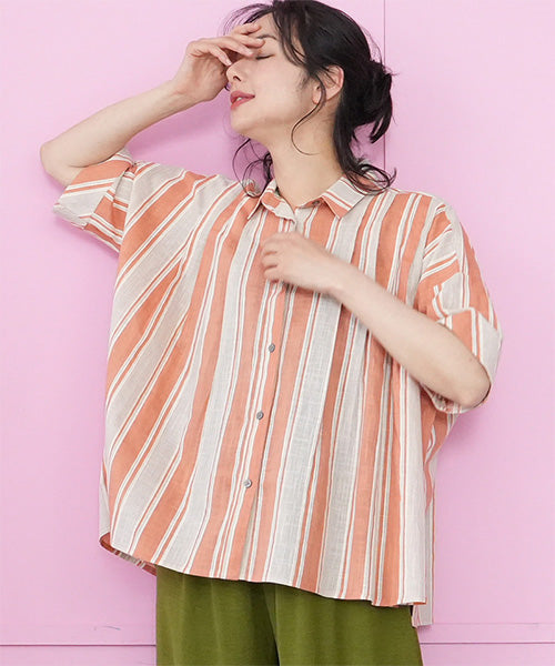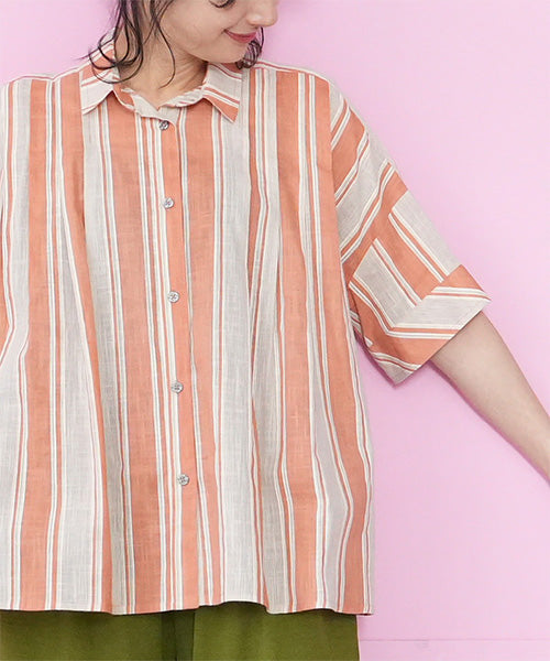変則的なストライプ柄が涼しげな、ショート丈のシャツブラウスです。