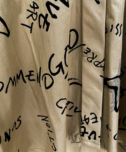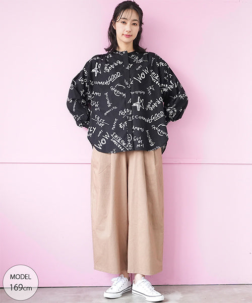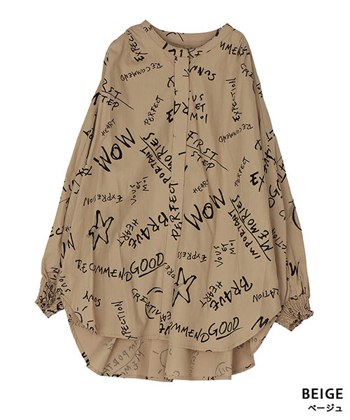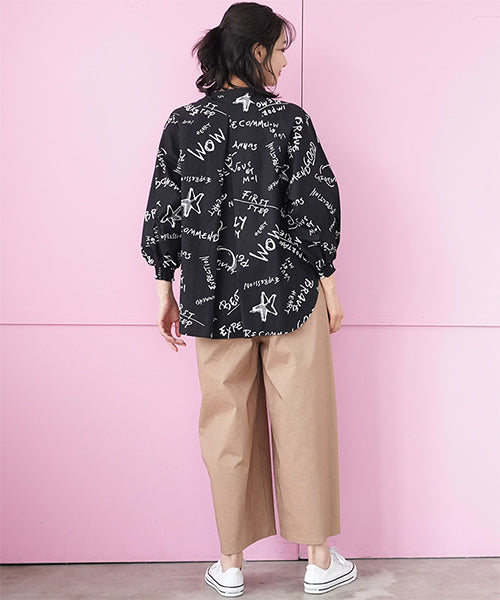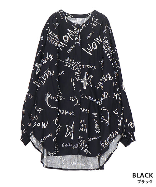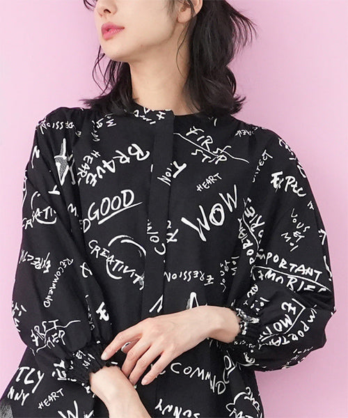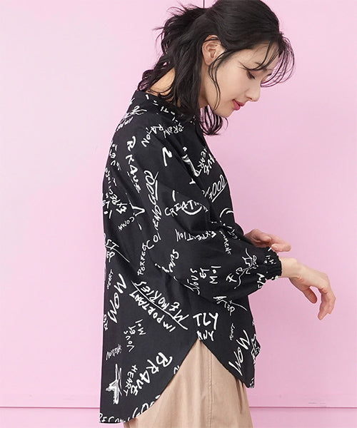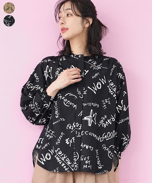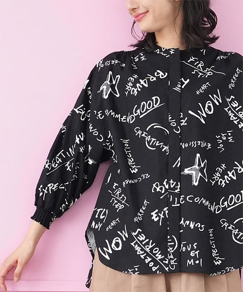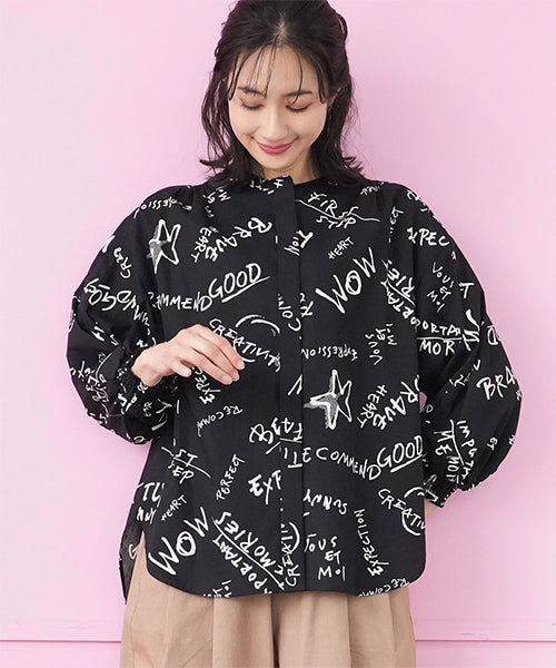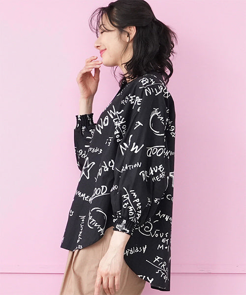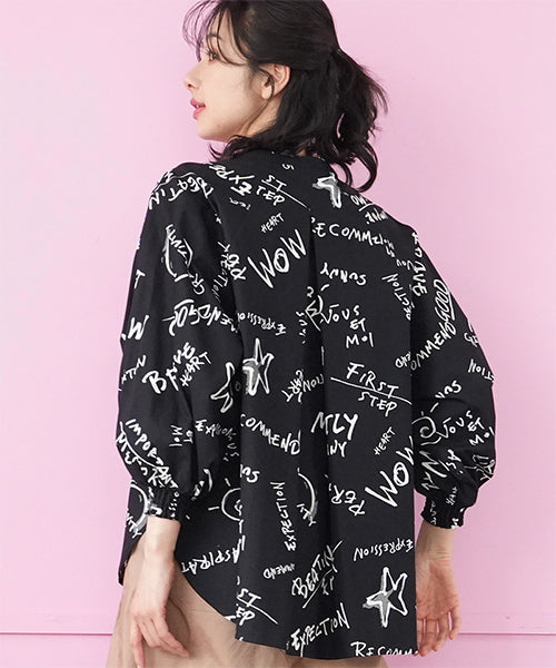 手描き風のロゴやモチーフを散りばめた、存在感のあるプリントブラウス。 ラフさと遊び心を感じさせるデザインで、コーディネートの主役になる1枚です。 程よく落ち感のある素材を使用し、ゆったりとしたシルエットながらも軽やかな着心地。 袖口にはシャーリングを施し、ふんわりとした立体感をプラスしました。 前開き仕様のため、羽織りとしても着用でき、着回し力も◎。