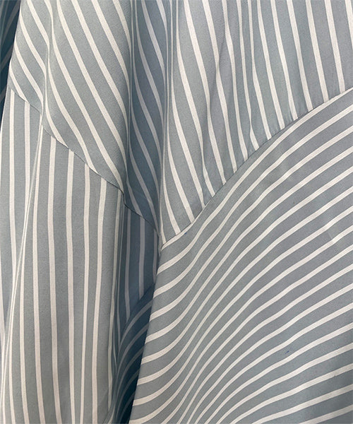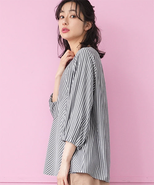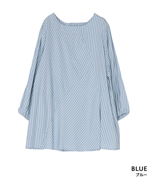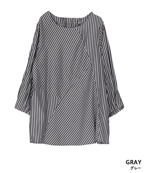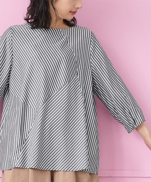 異なる向きのストライプを組み合わせた、アシンメトリー切り替えデザインのブラウス。