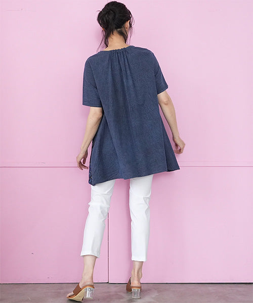 ゆったりと広がるAラインシルエットで、体のラインを拾いにくくリラックスした着心地。