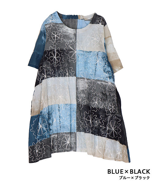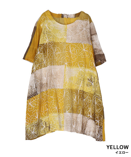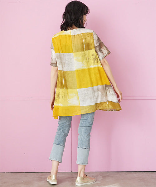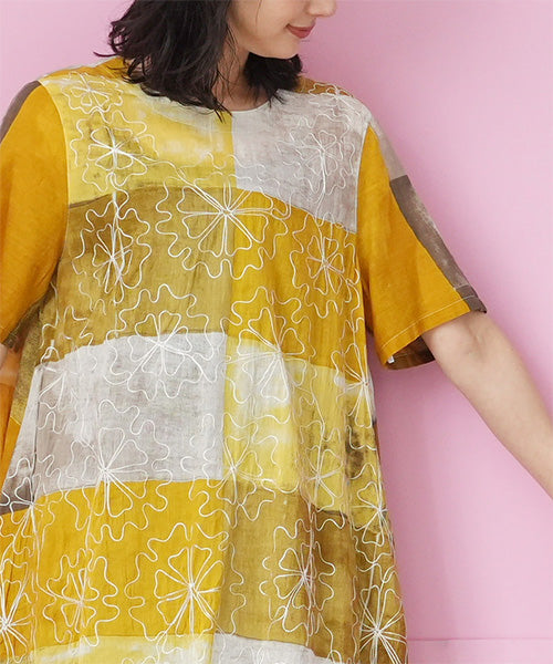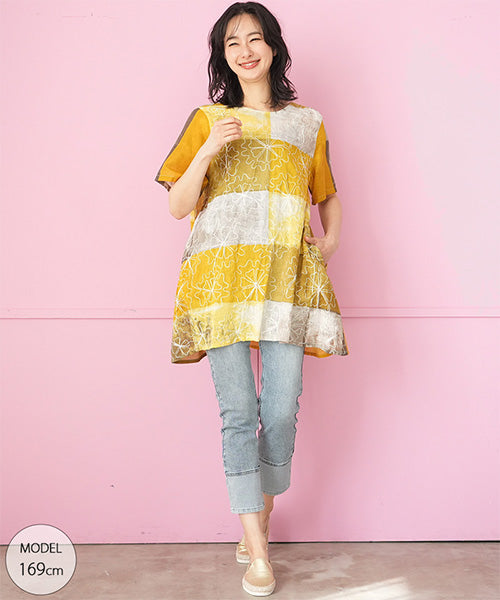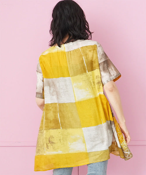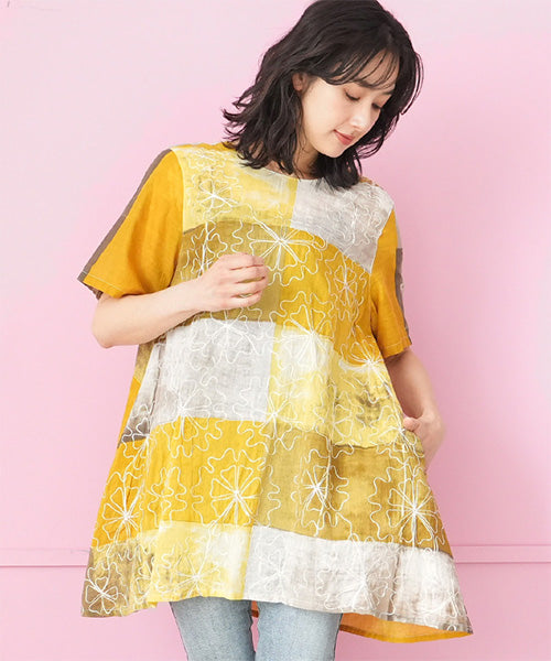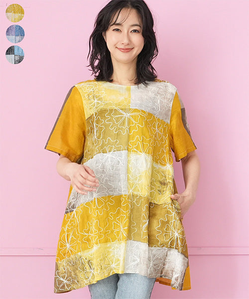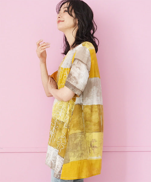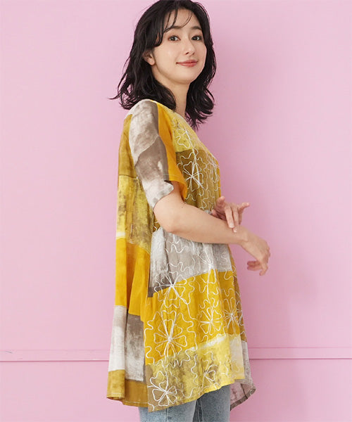ムラ染風のプリントにコード刺繍を施した、凝ったデザインのチュニックです。