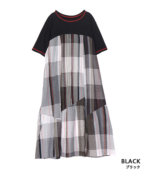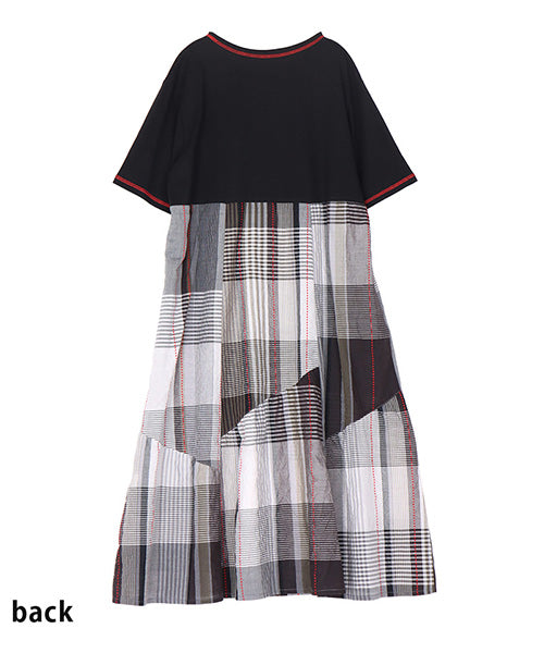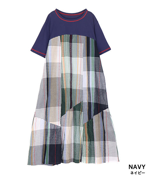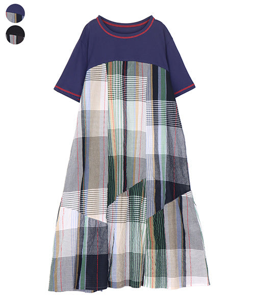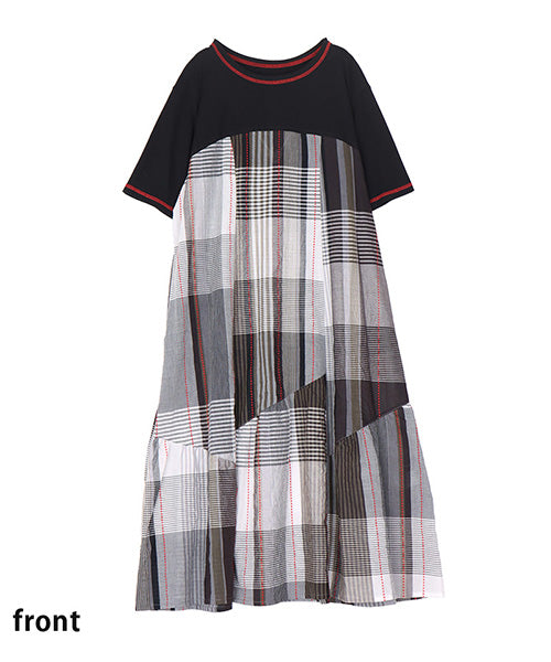 無地とチェック柄を絶妙なバランスで切替えた、半袖ロングワンピースです。 トップスの高い位置で切り替えたため、脚長効果でスタイルアップが目指せます。 オール綿素材で、スッキリとした肌触りが自慢です。 オーバーサイズデザインは、ゆったりと涼しいのにシルエットの着膨れ感は少なくなっています。