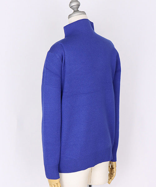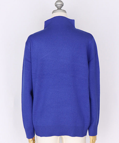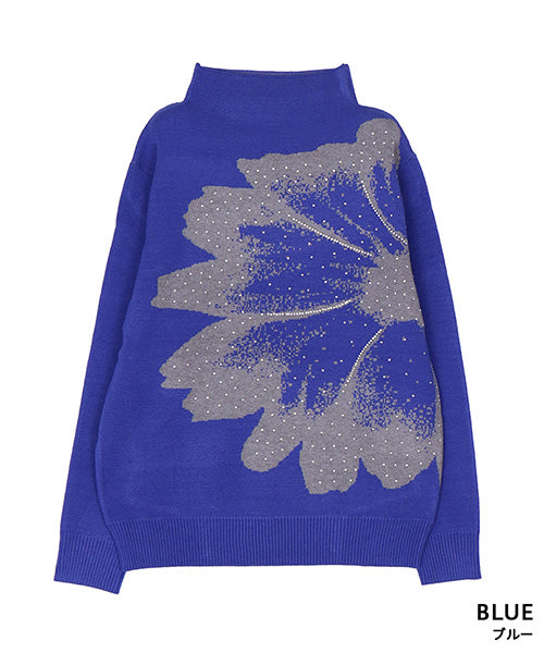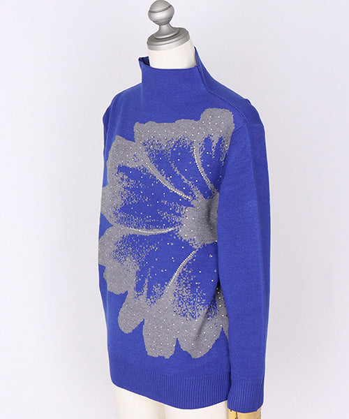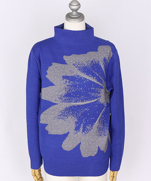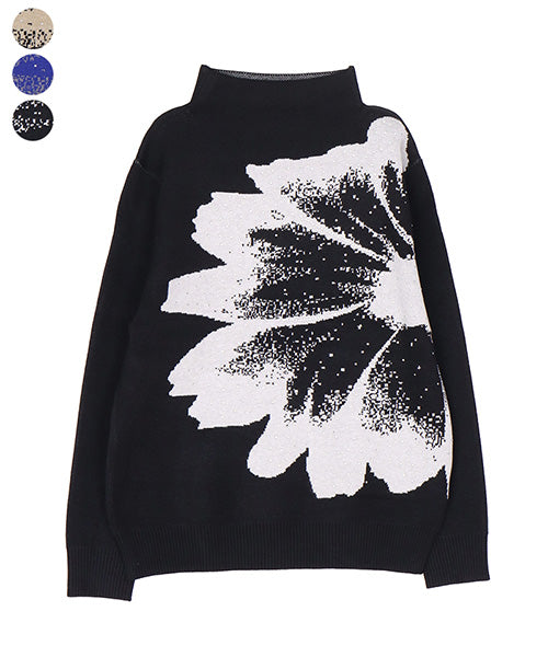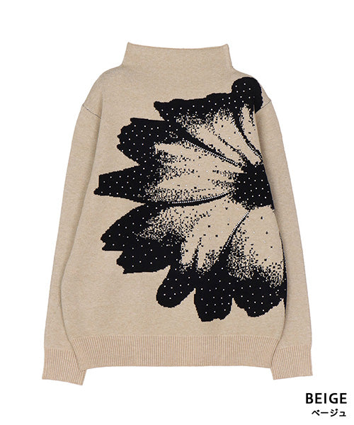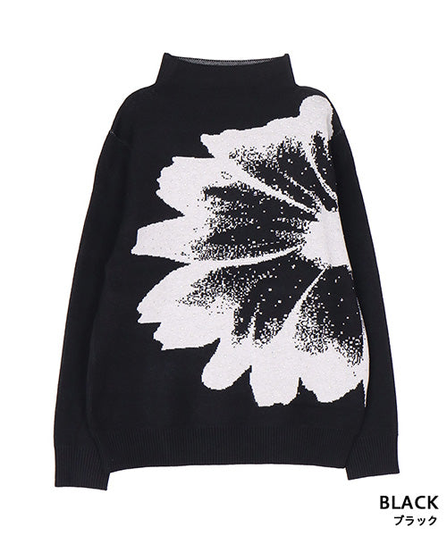 大きな花柄が目を惹く、存在感たっぷりのハイネックニット。