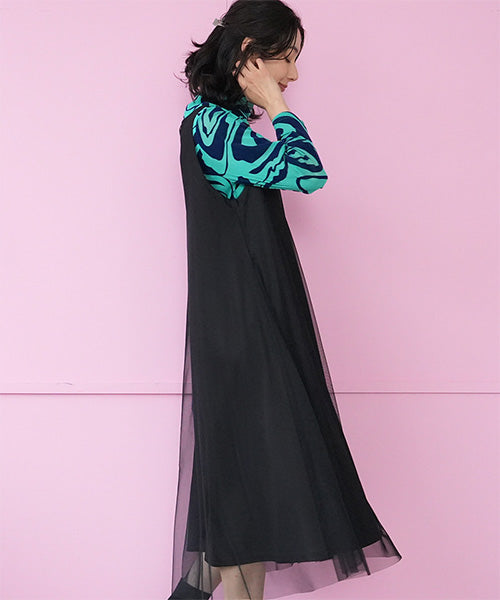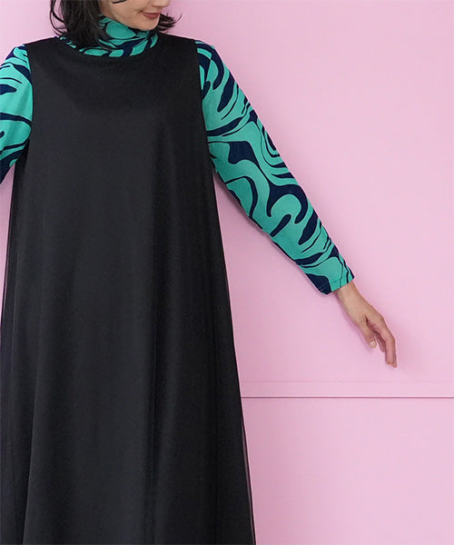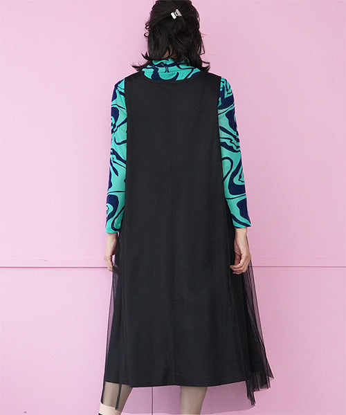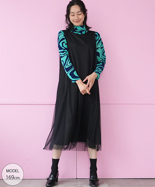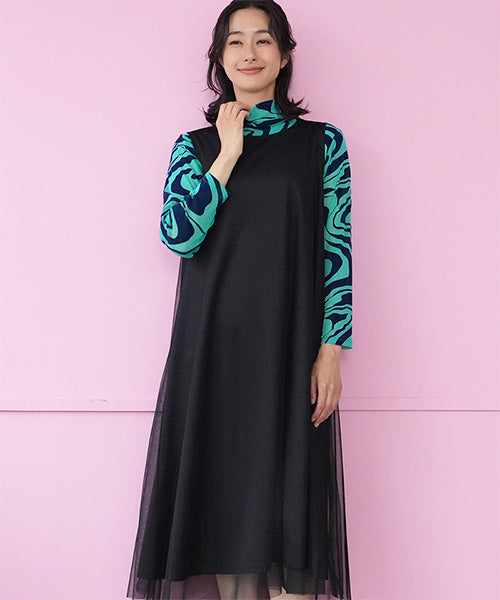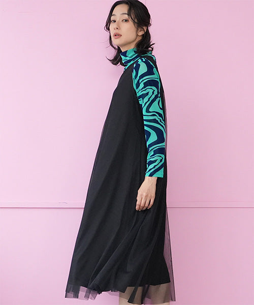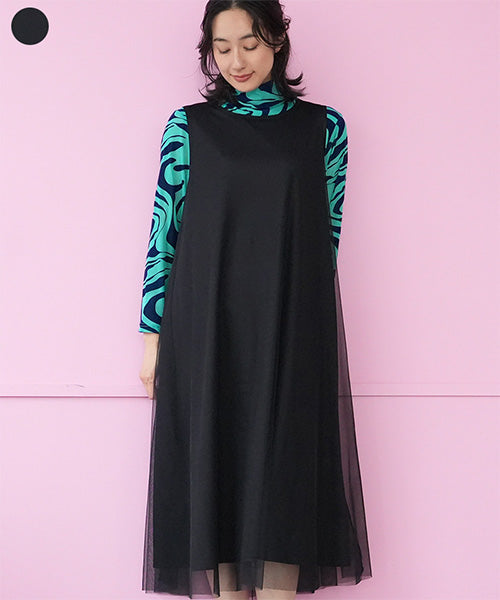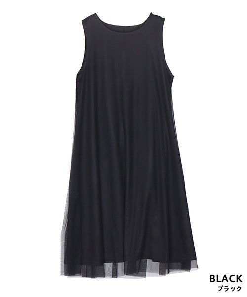 シンプルなAラインシルエットに、チュールが軽やかな抜け感をプラスしたノースリーブワンピース。