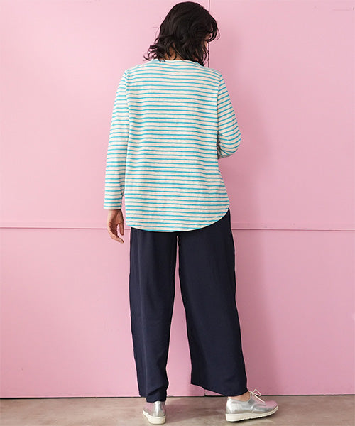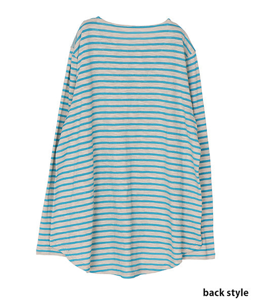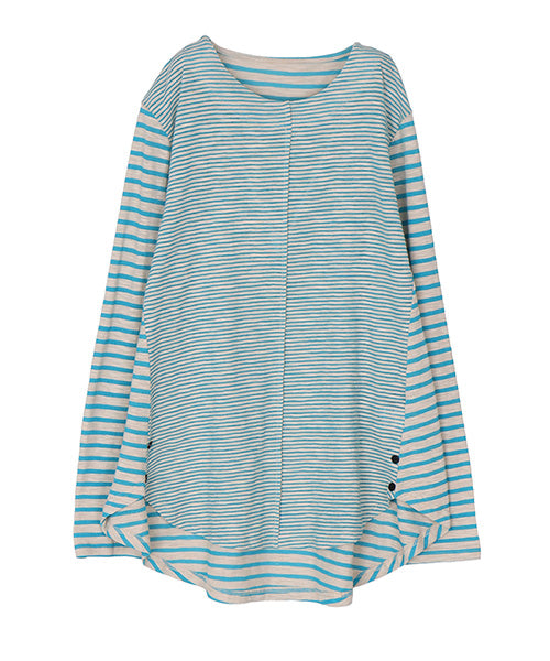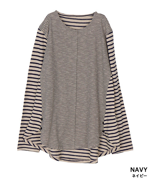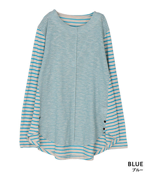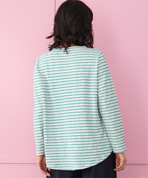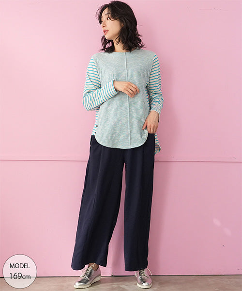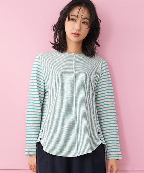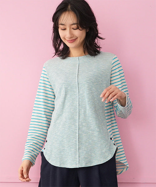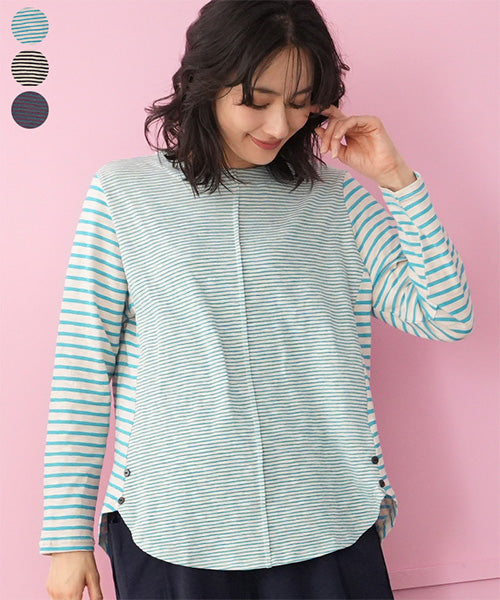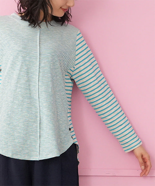 細かなボーダー柄をベースに、袖部分の配色切り替えデザインがお洒落なカットソー。