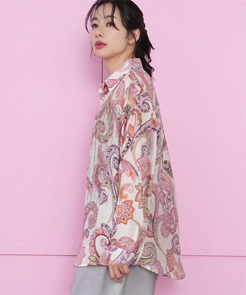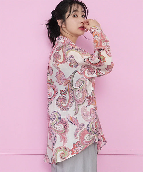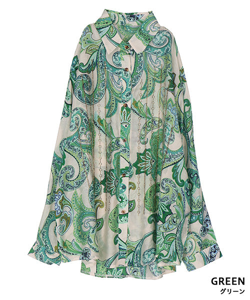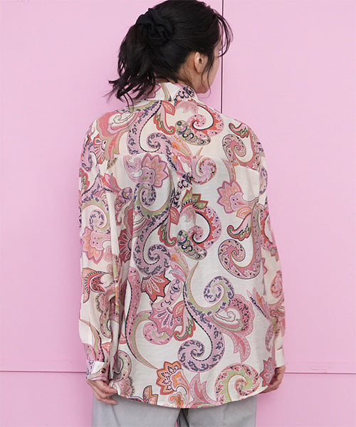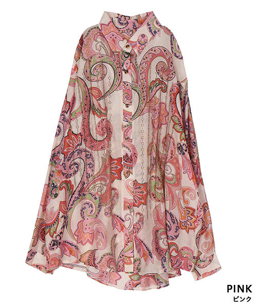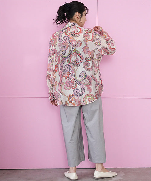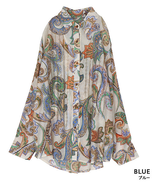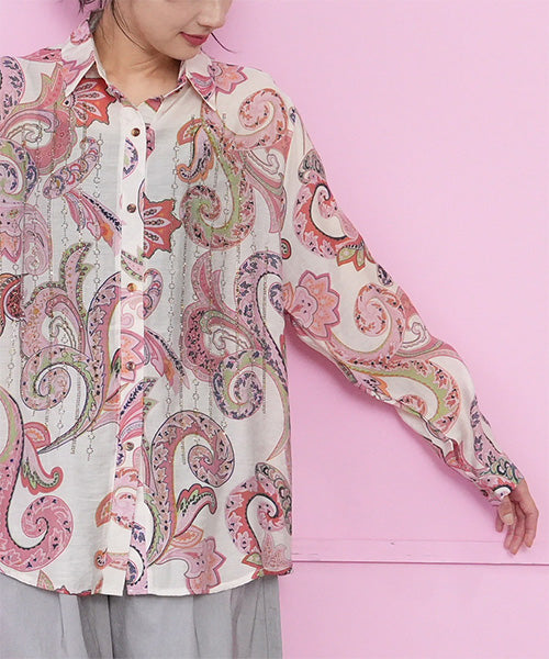 シアー感のあるオリエンタル柄の、大人っぽいシャツブラウスです。