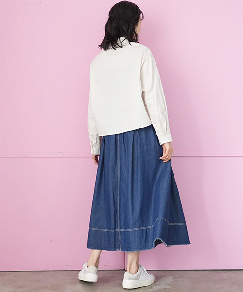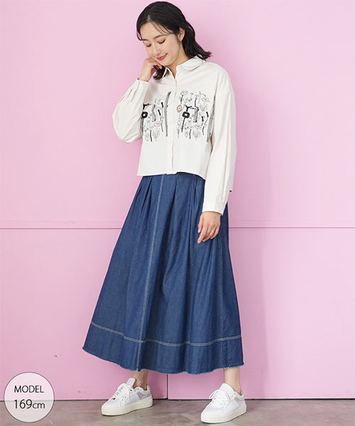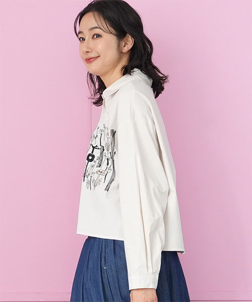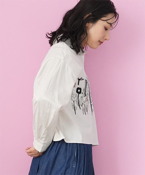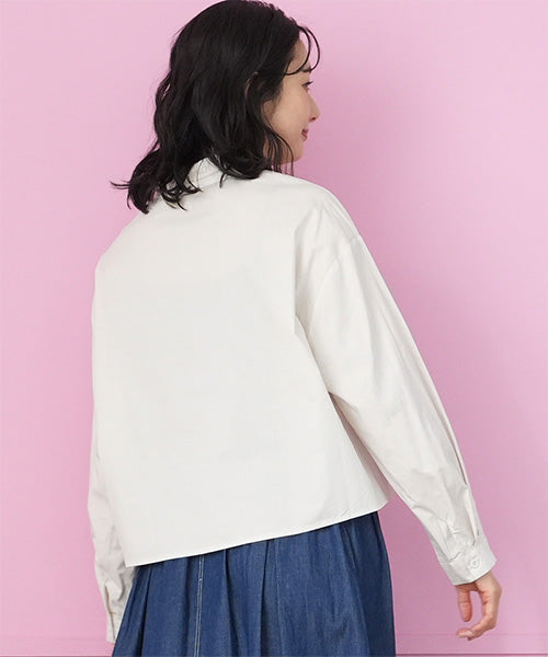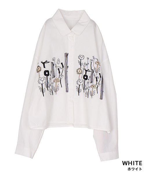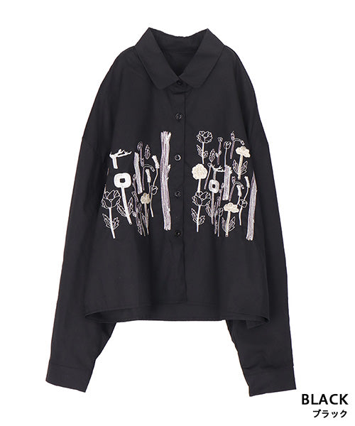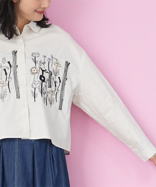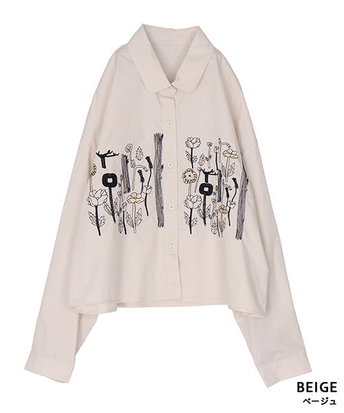 フロント部分にボタニカル刺繍を施した、ショート丈シャツブラウスです。 ラウンドカラーが、清楚な可愛らしさを醸し出しています。 ドロップショルダーにオーバーサイズなので、キチンと見えなのに楽な着心地です。