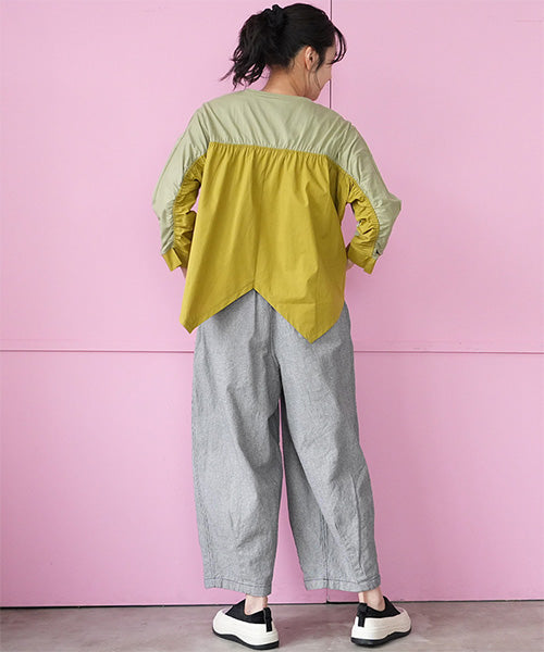 後ろ身頃から袖にかけてゴムを通し、動きやすさとデザイン性を高めました。