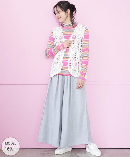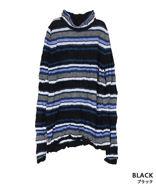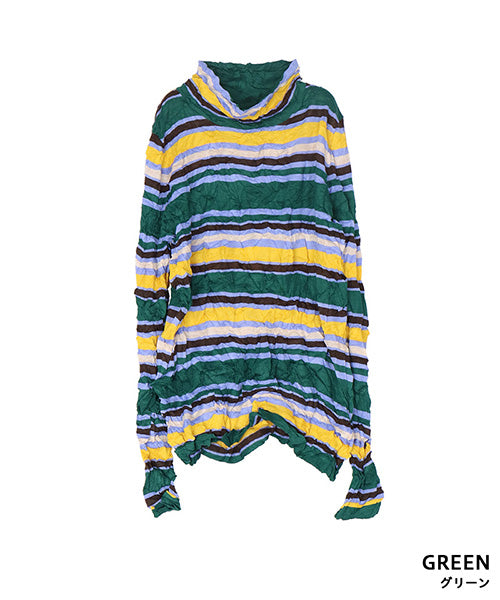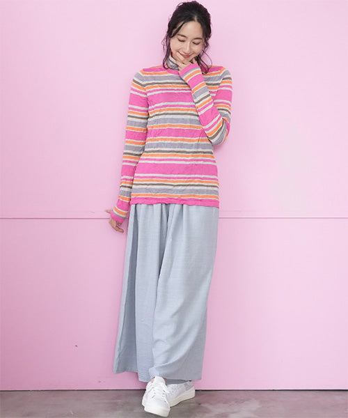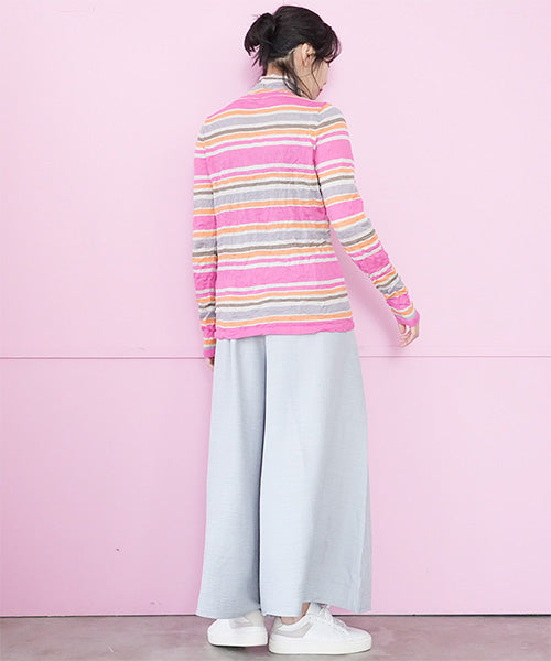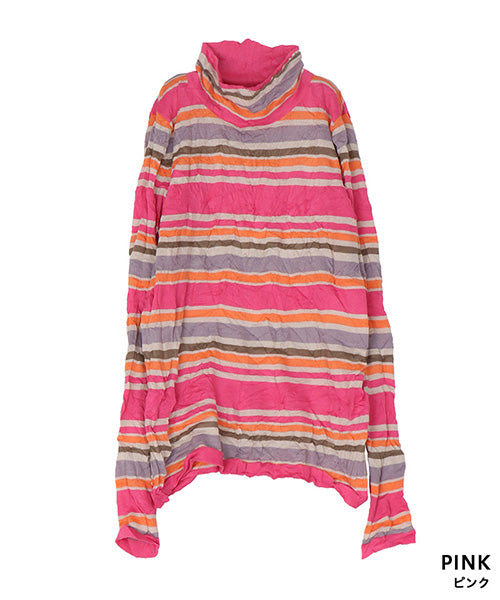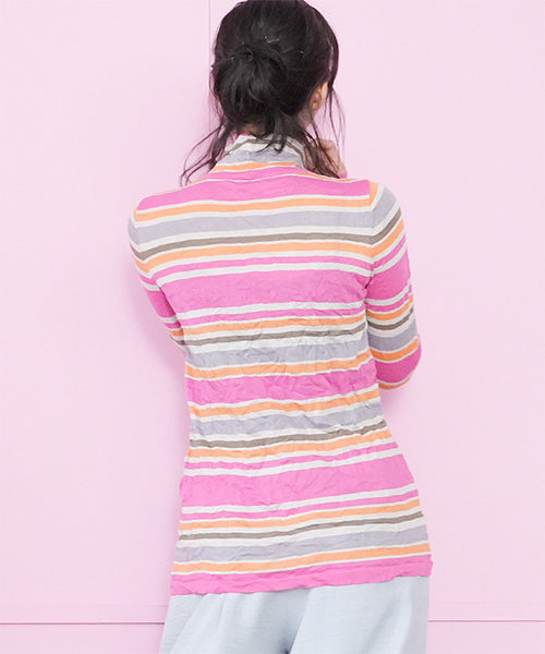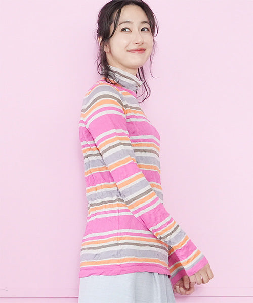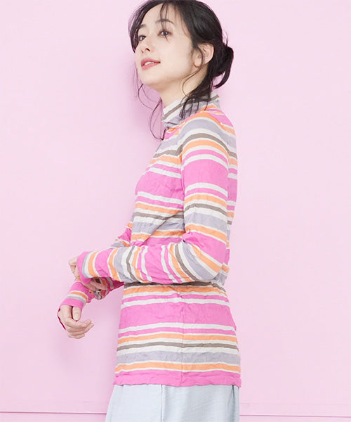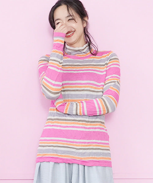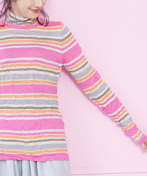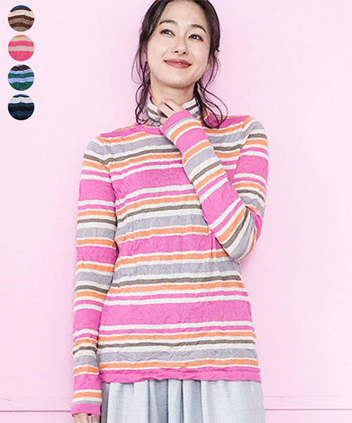カラフルなボーダー柄のワッシャー加工カットソーです。 とても小さく見えますが、強ストレッチが効いているためボディに心地よくフィットします。 冬はインナーとして、春・秋はレイヤードで、と3シーズン活用できます。 生地も柔らかでストレスフリーの着心地です。