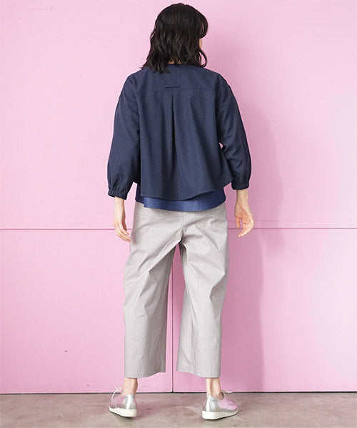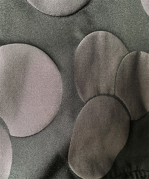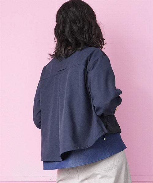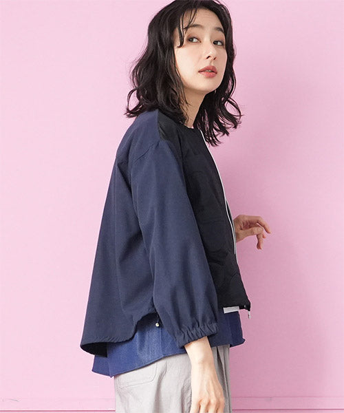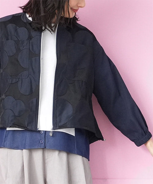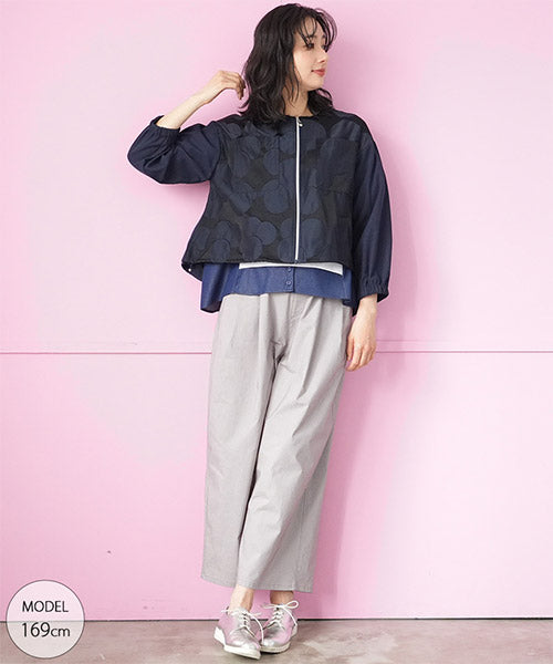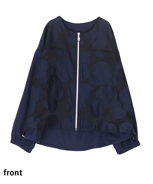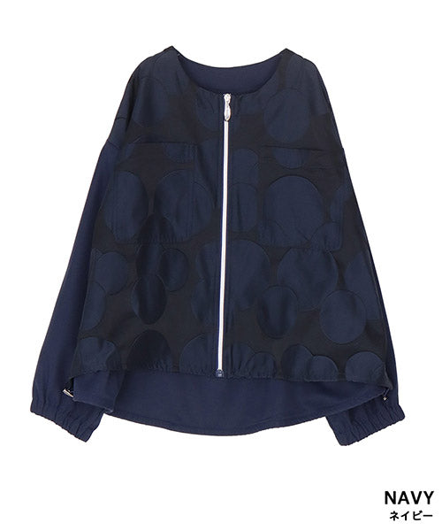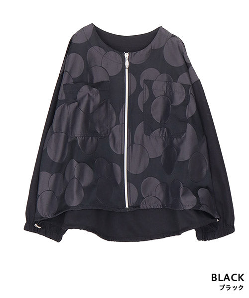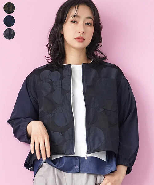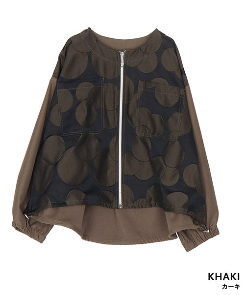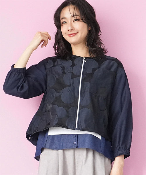 大小ドット生地と無地の異素材切替えジップジャケットです。 胸にパッチポケット、裾はドロスト仕様で凝った作りなっています。 前ファスナー開きなので、脱ぎ着しやすく快適です。 フィッシュテール加工でヒップが少し隠れ、脚長効果が期待できます。