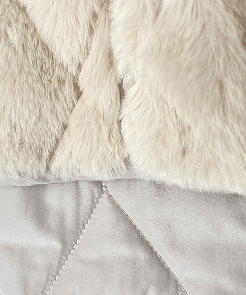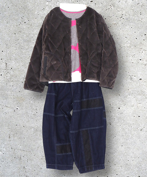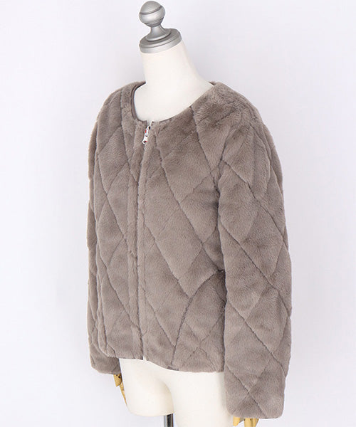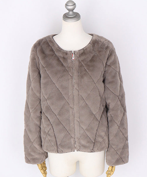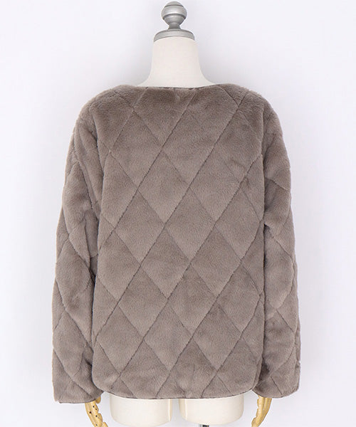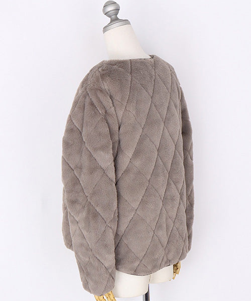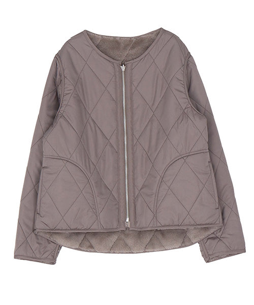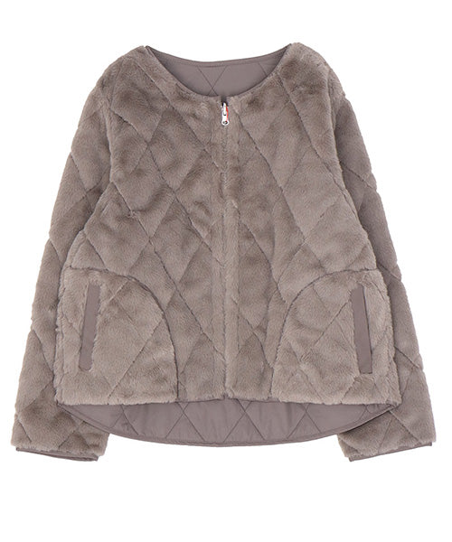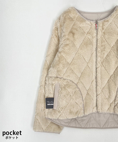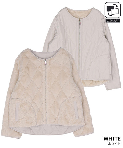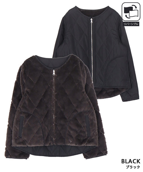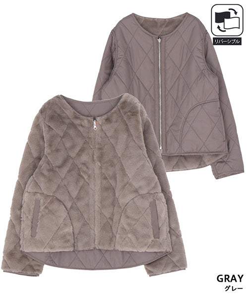 ふんわりとしたフェイクファーと、すっきりとしたキルティングの両面を楽しめるリバーシブルジャケット。 その日の気分やコーディネートに合わせて、印象を変えられる便利な1枚です。 フェイクファー面はあたたかみのある柔らかな風合いで、キルト面は軽やかでカジュアルな印象に。 ノーカラーデザインなので、タートルネックやマフラーとの相性も抜群です。