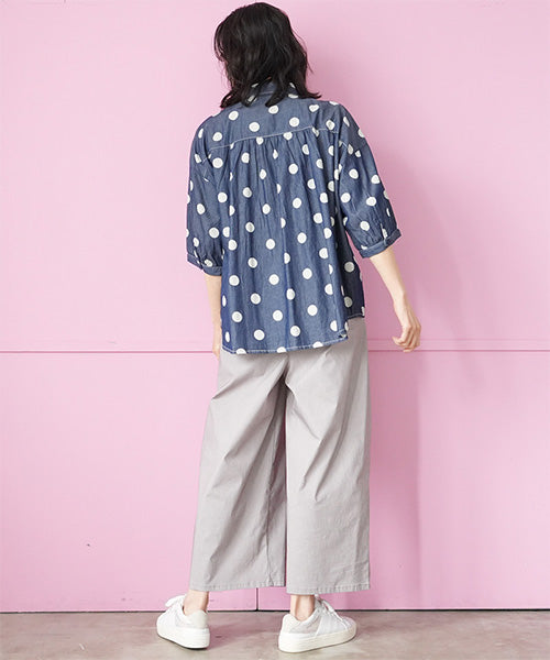後ろヨークと袖口にギャザーを寄せ、ふんわりとした可愛らしい印象に仕上げています。
