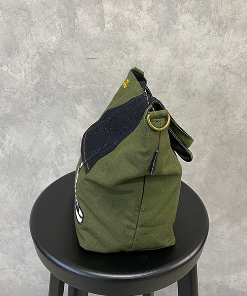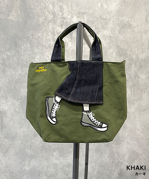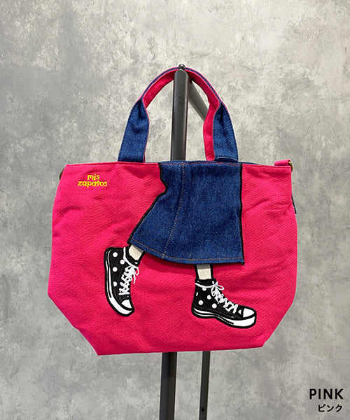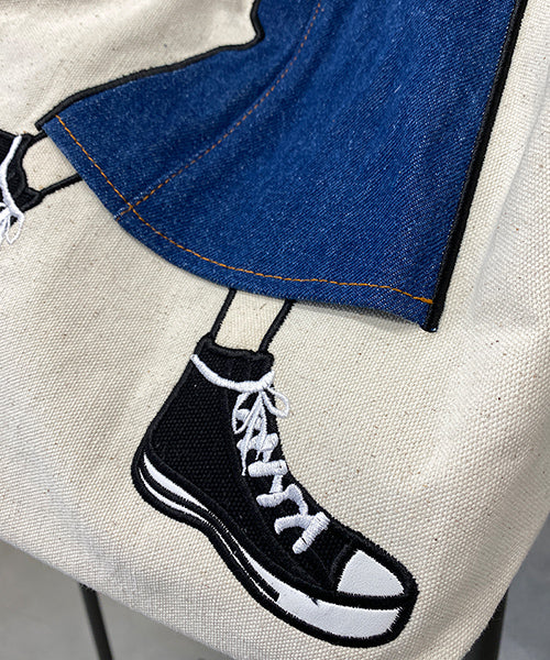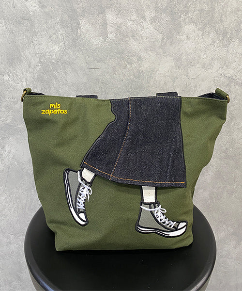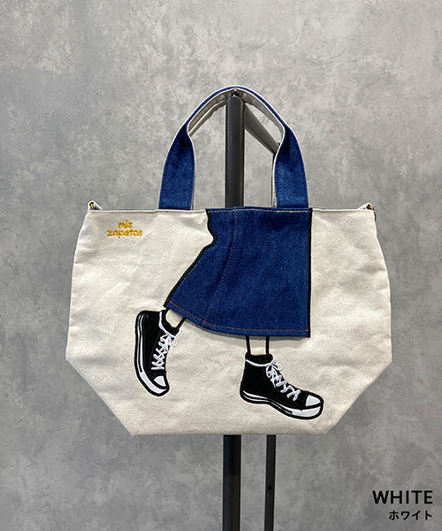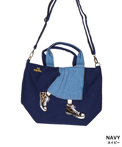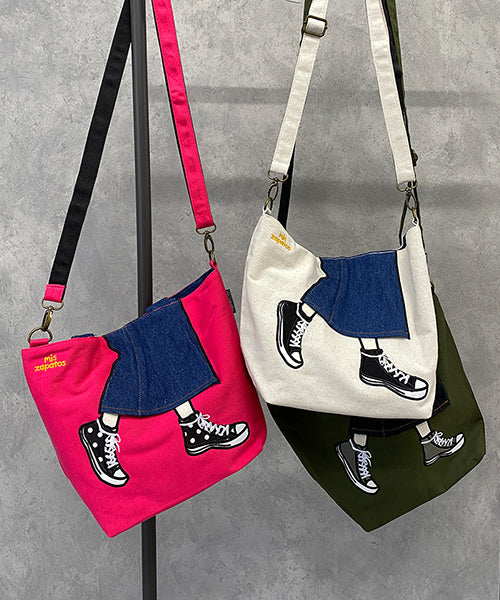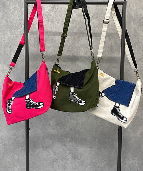 スカートとスニーカーをモチーフにしたユニークなイラストが印象的な2wayショルダーバッグ。