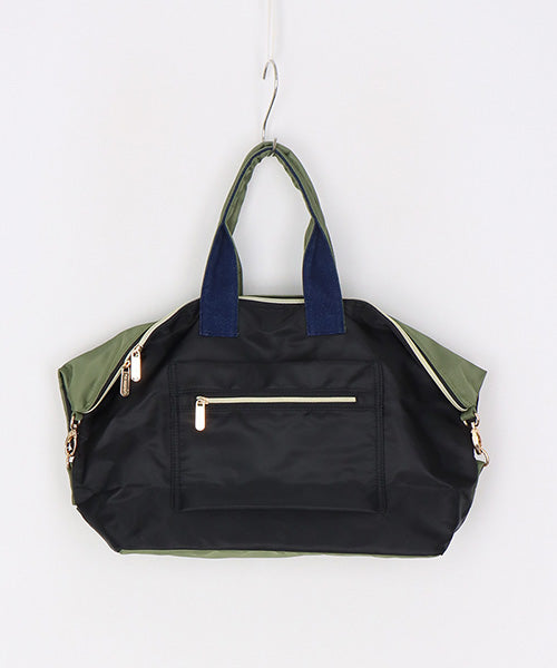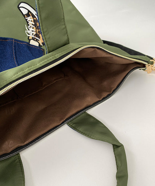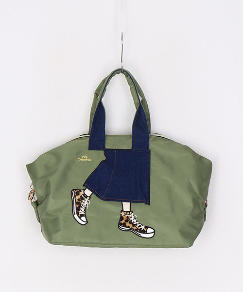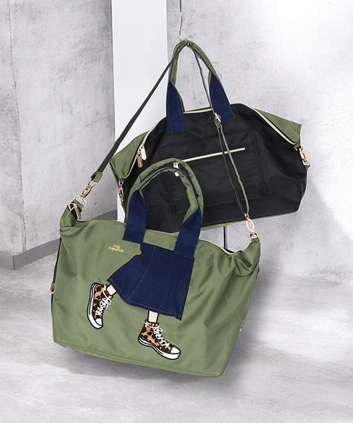 スカート×スニーカー柄が印象的なボストン型バッグ。 背面にはキャリーケースのハンドルに通せるファスナーポケット付きで、旅行時の持ち運びも快適です。 2WAY仕様で、手持ち・肩掛けの使い分けが可能。 開口部は大きく開くファスナータイプで、荷物の出し入れもスムーズ。 A4サイズや着替え、ポーチ類、500mlペットボトルなどがしっかり収まり、1泊2日程度の旅行や出張に最適な容量です。 仕様:ファスナー開閉 背面:ファスナーポケット、キャリーオン 内側:ポケット×1 持ち手:41cm ショルダー×1 (取り外し可 最長108cm金具部分含む)